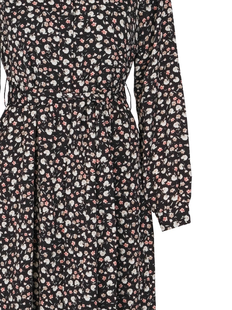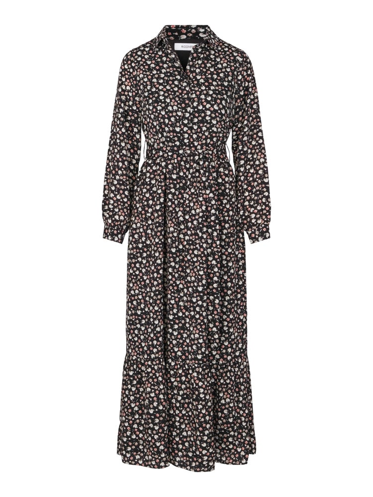 Anabela Dress i nydelig print denne våren! Kjolen har knepping til under brystet, kappe skjørt og knyting i midjen. Lang kjolemodell. Skjortekrage. Passer godt til sesongens festligheter. Lett og behagelig kvalitet.